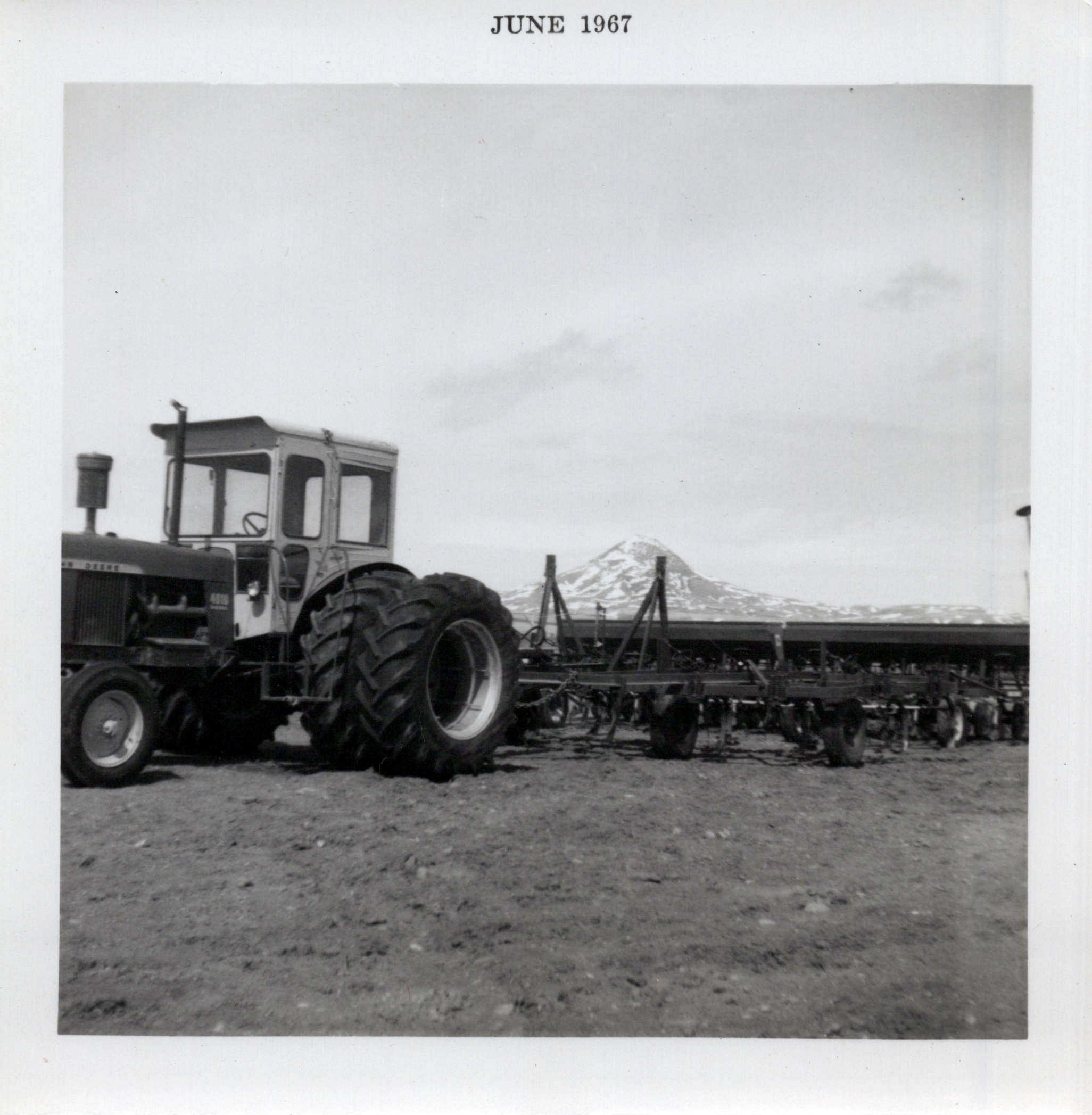 Ralph Olson driving the John Deere tractor. Frank Heydon pumping diesel fuel into the tractor with his cowboy hat on. Red tractor and John Deere summer following. Frank Heydon driving the red tractor and Grandpa Ralph Olson driving the John Deere. End of movie with Merry standing by a full rushing stream.